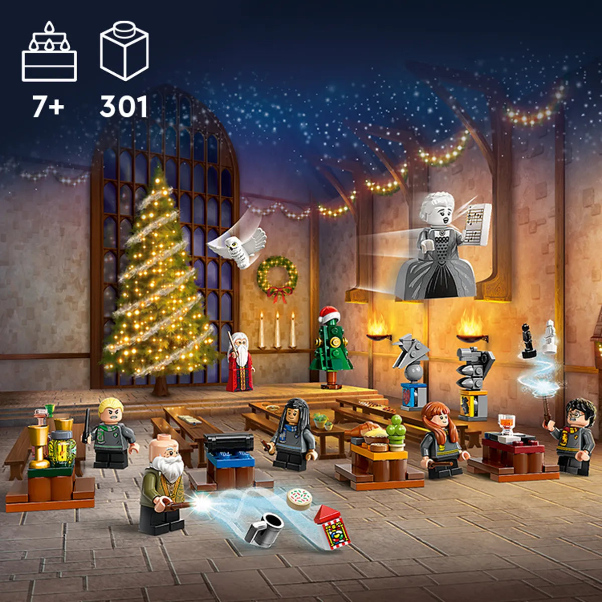 - Set includes 8 LEGO® Harry Potter™ toy characters – Harry Potter, Susan Bones, Cho Chang™, Draco Malfoy™, Albus Dumbledore™, Professor Flitwick and Choir Ghost minifigures, plus a Hedwig™ figure
