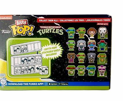 Pack Contents: A set of 12 mini Bitty Pop! vinyl figures featuring characters from the Teenage Mutant Ninja Turtles franchise (reportedly includes Leonardo, Michelangelo, Donatello, Raphael, April O’Neil, Splinter, Shredder, Rocksteady.