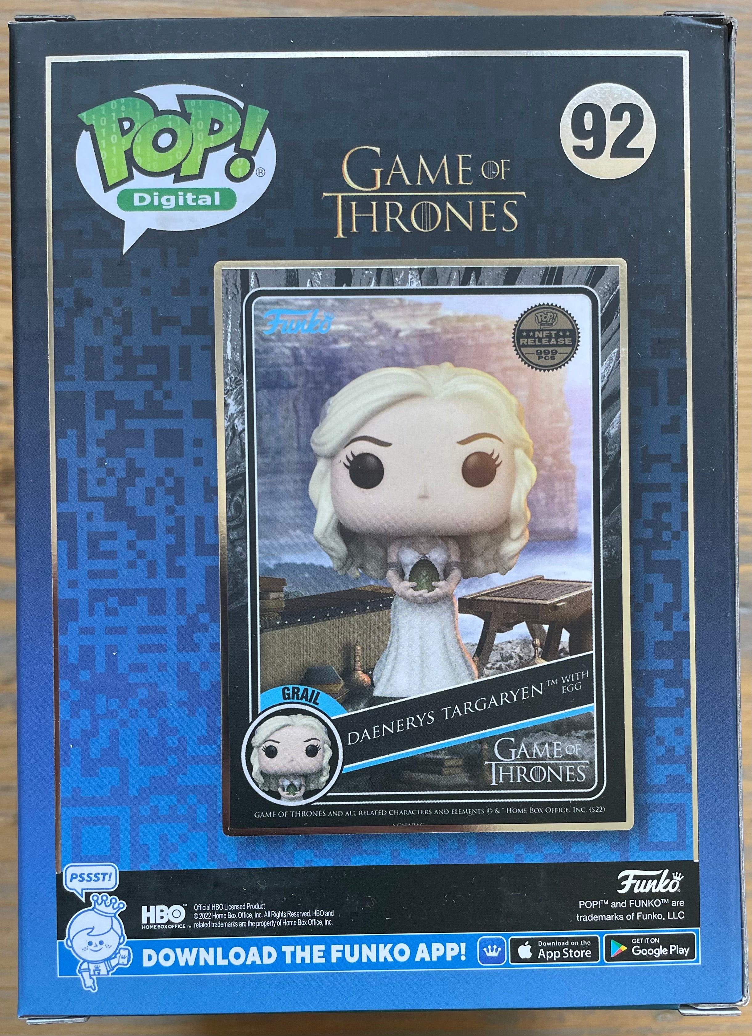 This is a Limited edition Funko physical collectible, designed exclusively for the Game of Thrones x Funko Series 1 Digital NFT release. Limited to just 999 pieces, this Grail features Daenerys (Stormborn of House Targaryen, the First of Her Name, Queen of the Andals and the First Men, Protector of the Seven Kingdoms, the Mother of Dragons, the Khaleesi of the Great Grass Sea, the Unburnt, the Breaker of Chains) holding a dragon egg and wearing her white dress from her wedding to Khal Drogo.