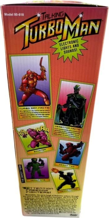 You don't want to come home without a Talking Turbo Man action figure for your collection. This exclusive, deluxe 13.5-inch tall action figure is fully posable, features electronic lights and sounds, and 3 action accessories are included. Collectible action figure has multiple points of articulation, requires 2 AA batteries, and is 13.5-inches tall. Batteries not included.