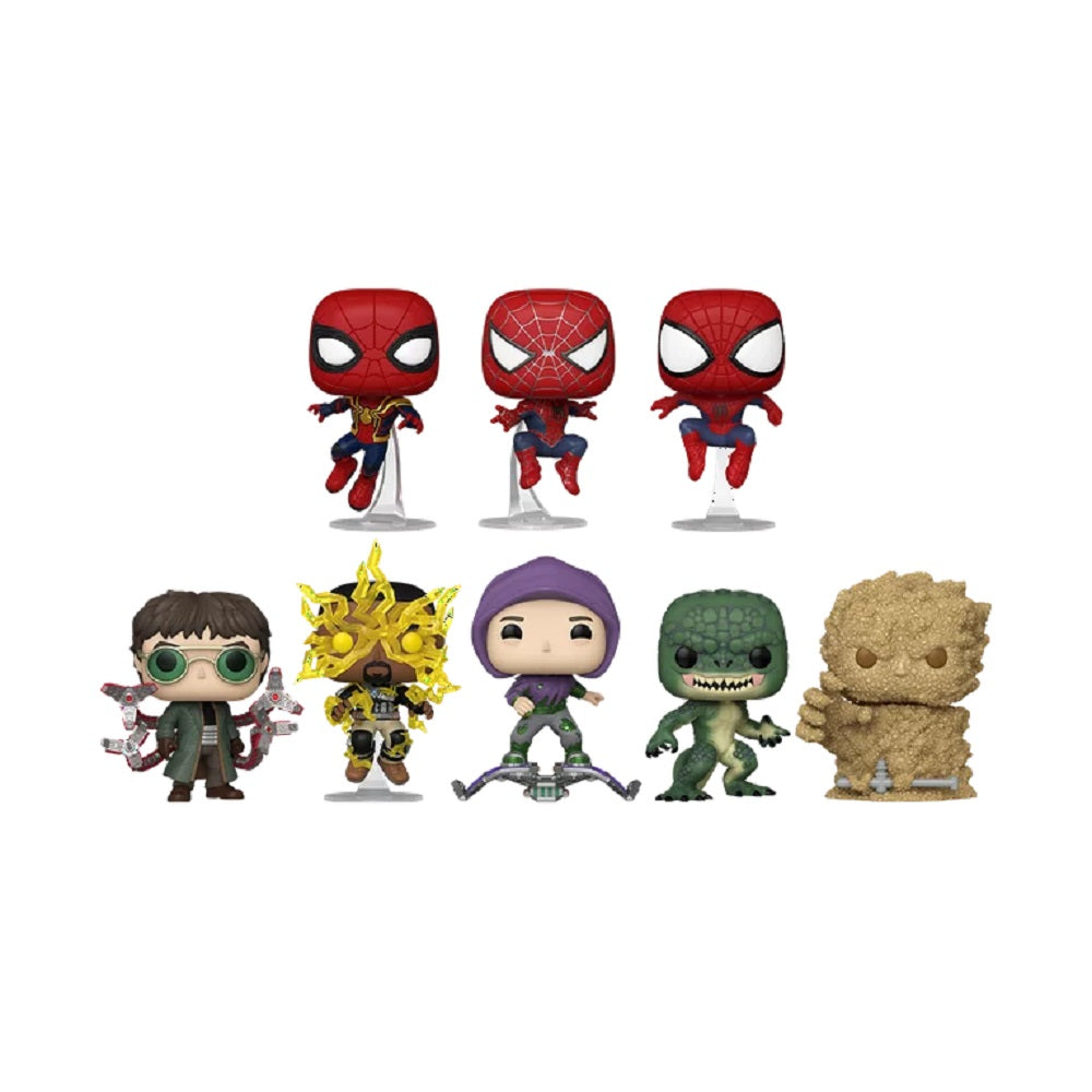 Swing into action with this exclusive Pop! 8-pack featuring leaping Spider-Man, Friendly Neighborhood Spider-Man, and The Amazing Spider-Man as they take on Doc Ock, Electro, Green Goblin, The Lizard, and Sandman. Help all three Peter Parkers face this challenge by incorporating them into your Spider-Man: No Way Home collection. Vinyl bobbleheads are approximately 3.75 to 4.9-inches tall.