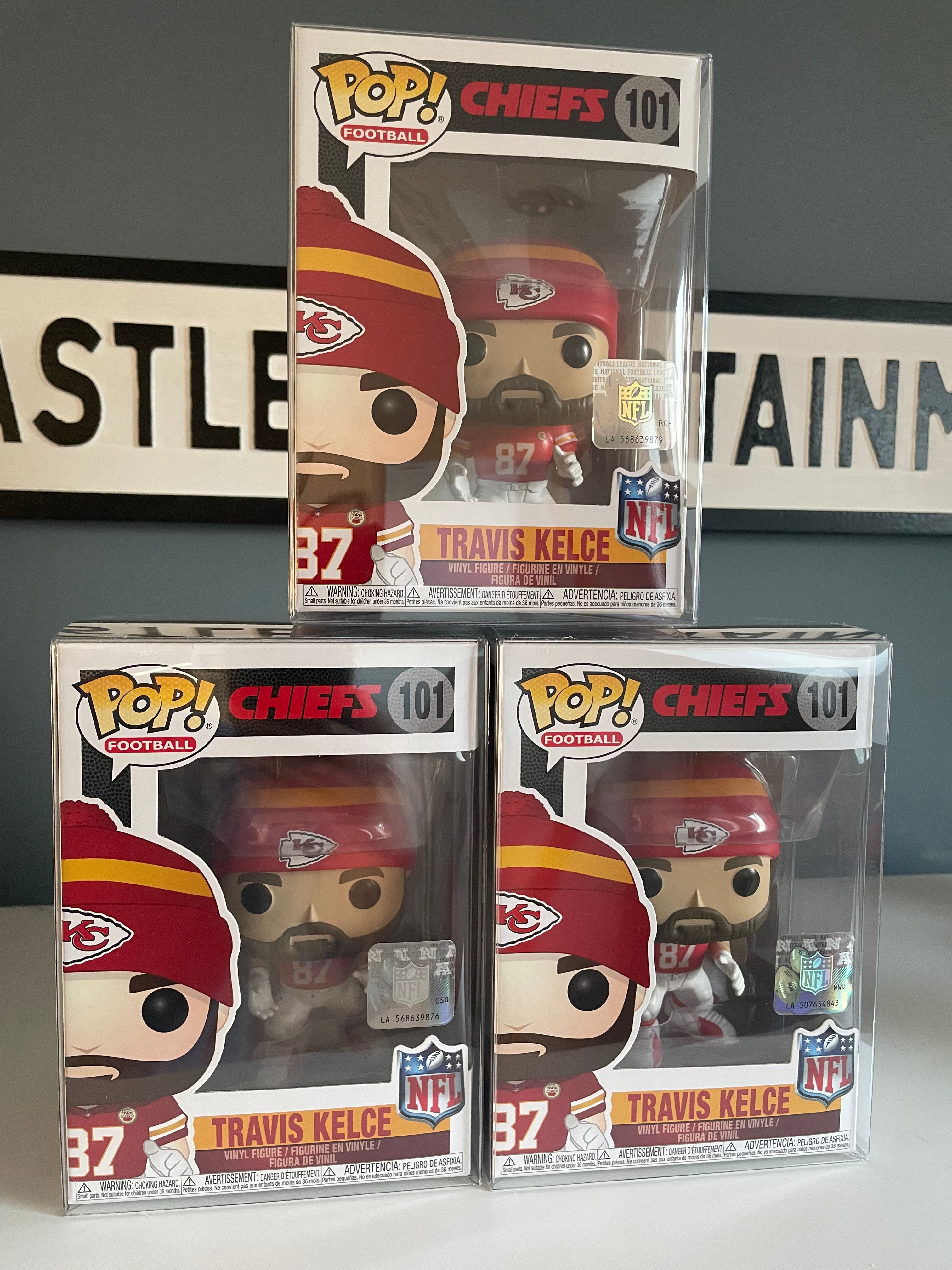 Celebrate the Chiefs' recent Super Bowl wins with this officially licensed Funko Pop! figure of Kansas City Chiefs' tight end Travis Kelce.