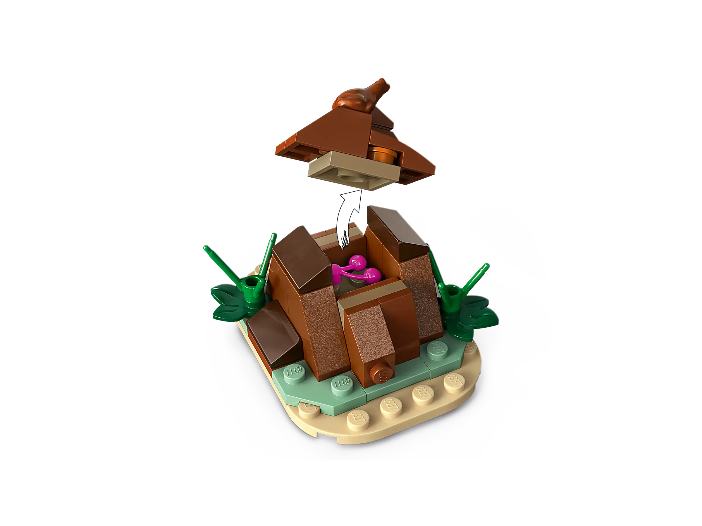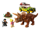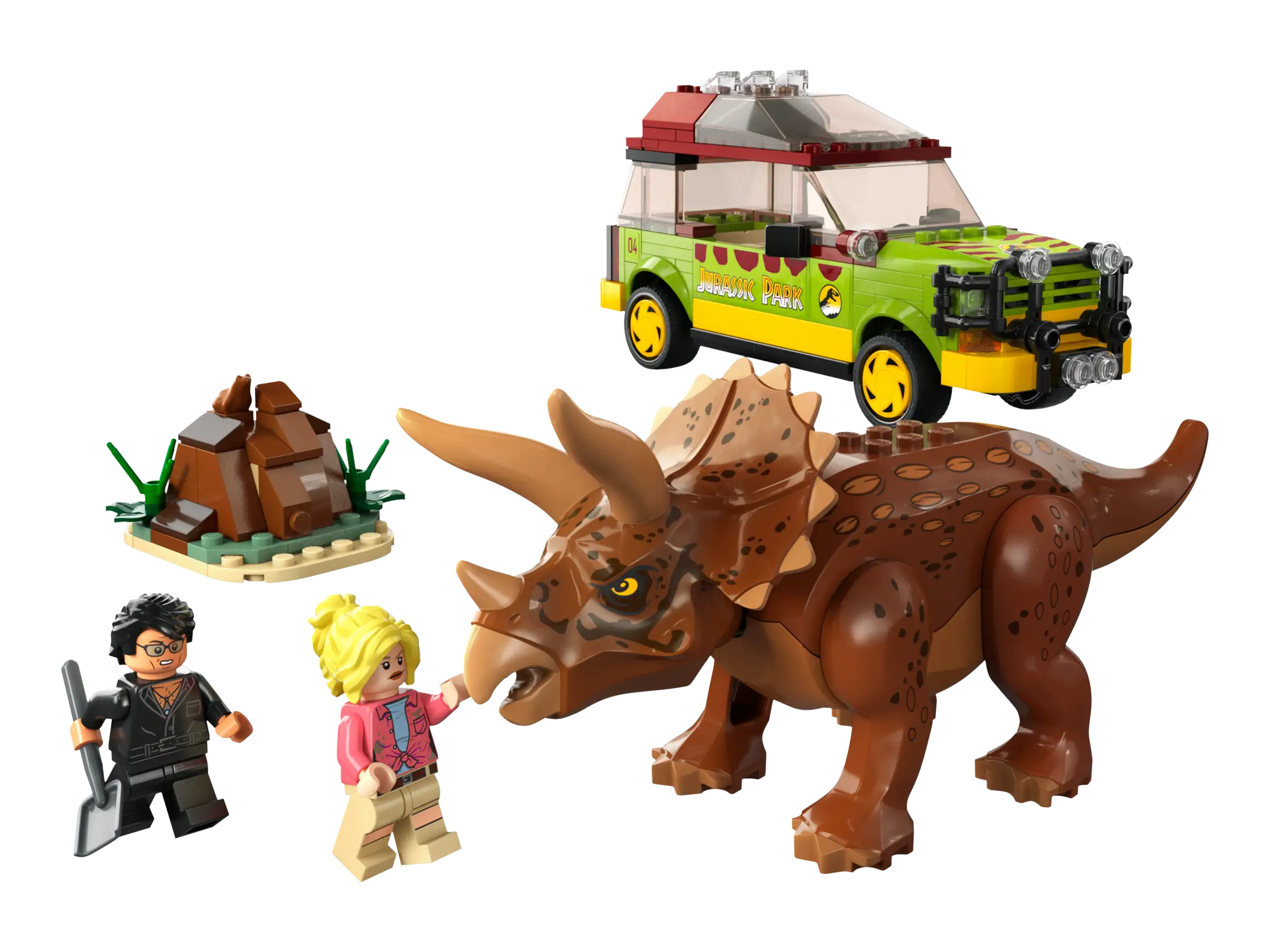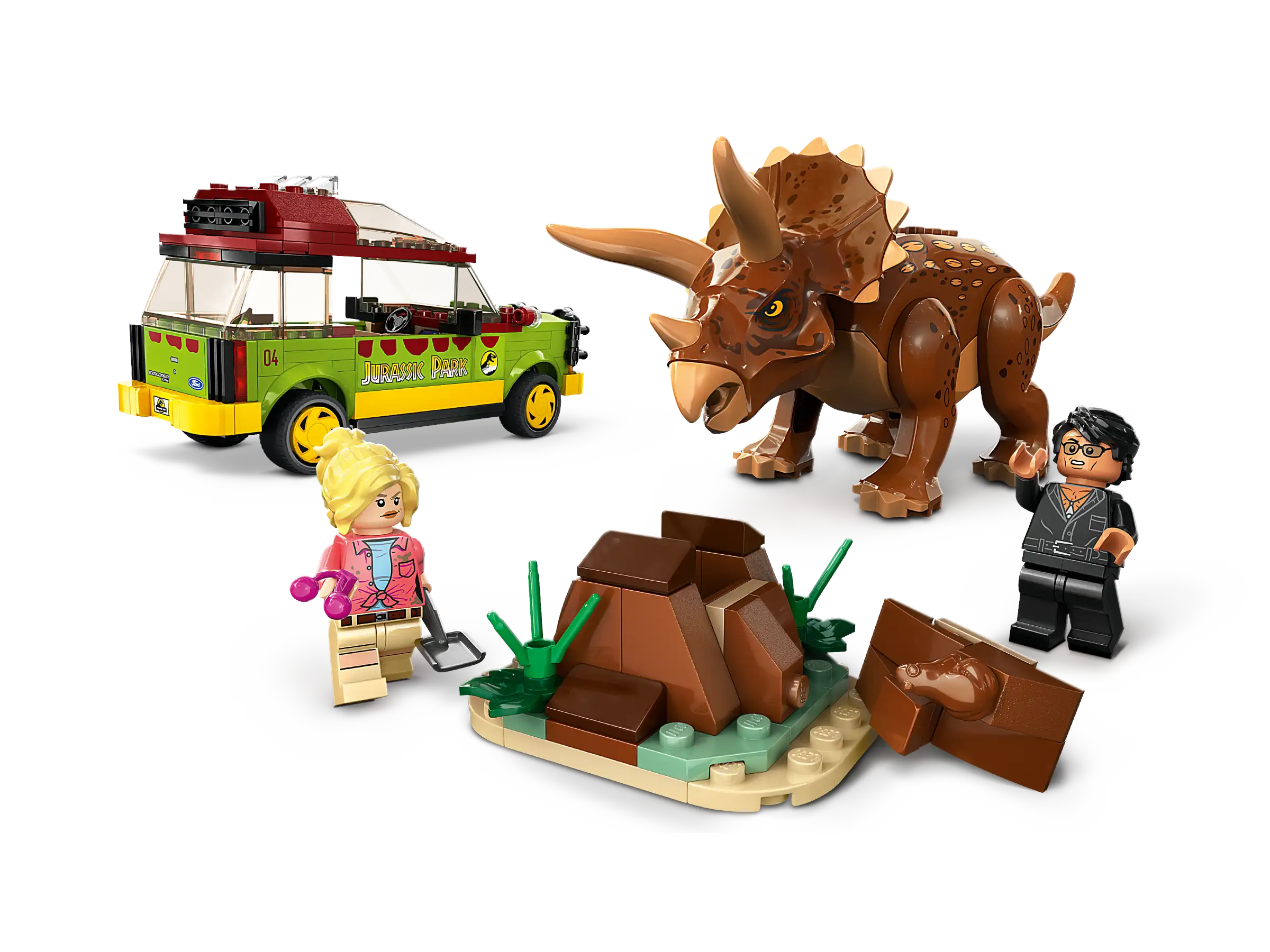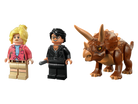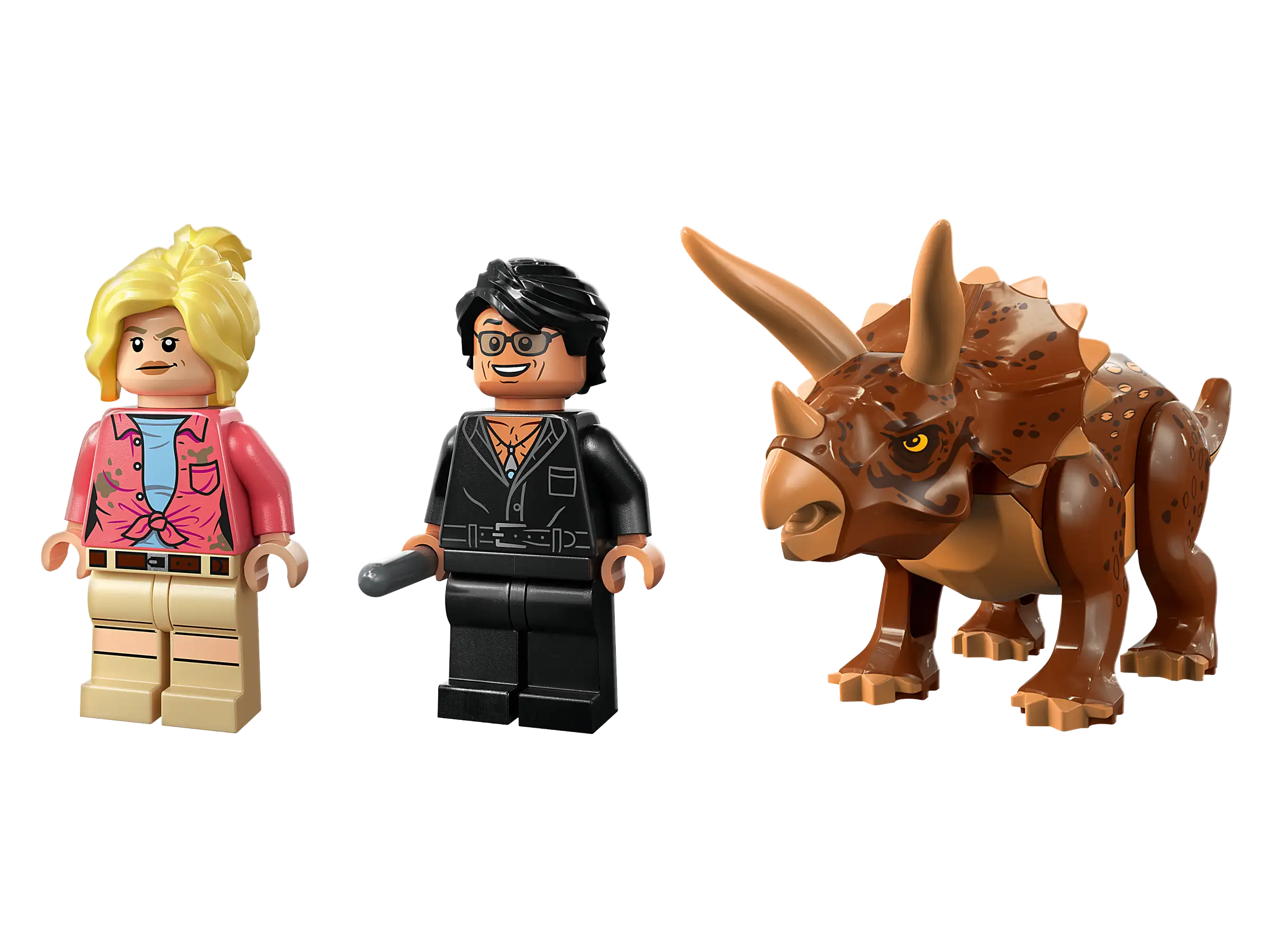 - Toy dinosaur and 2 minifigures – A posable Triceratops figure, plus Ian Malcolm and Dr. Ellie Sattler with a shovel element to scoop the hidden toxic berry element from the buildable dinosaur poop