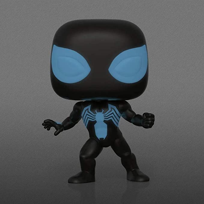 Funko Pop! of Spider-Man in Symbiote Suit, Peter Parker's change of costume that first appeared in Amazing Spider-Man #252. This Glow in the Dark Funko Exclusive is an absolute must-have for Spider-Man collectors.