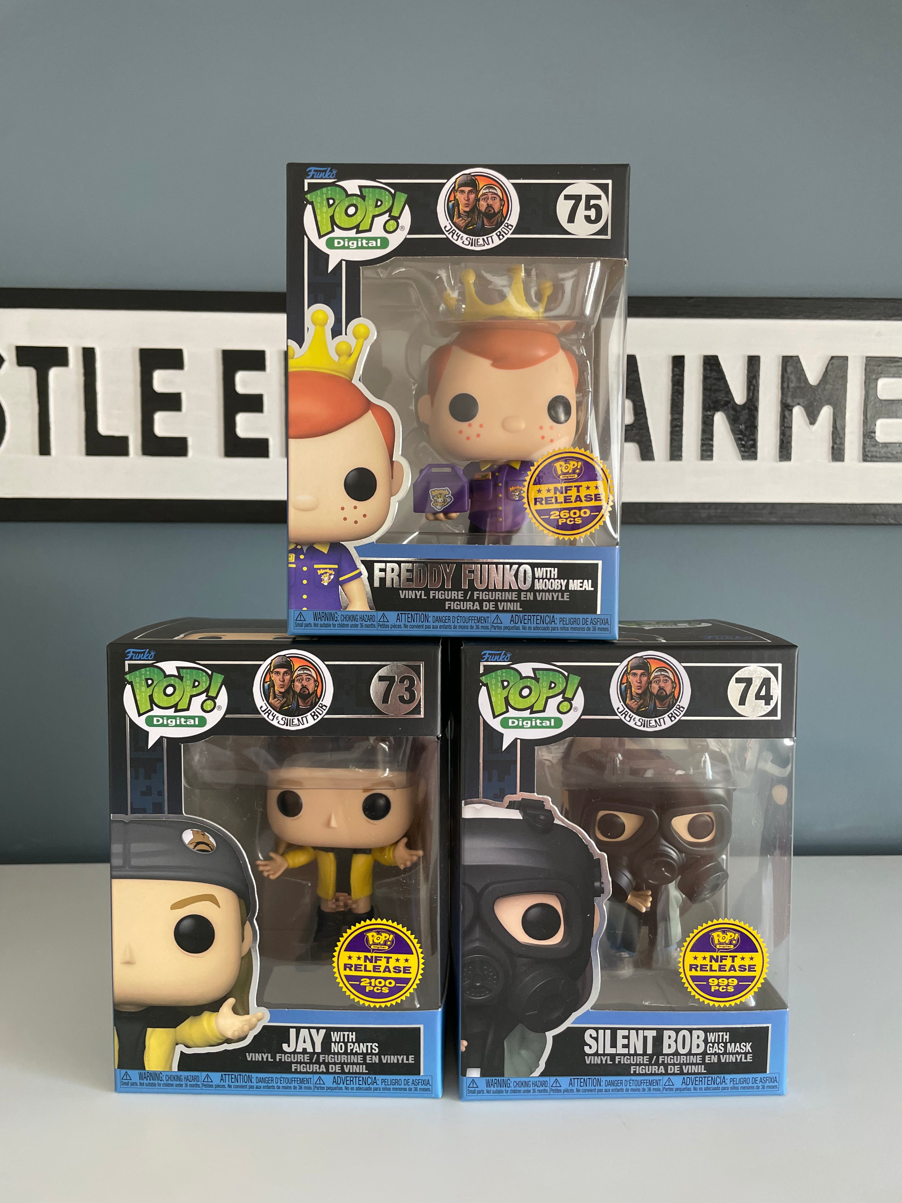 Complete set of all 3 redeemable Funko Pops (Grail, Legendary & Royalty) from the Jay & Silent Bob Funko NFT release. These are the physical Pops in boxes, per the images. Corresponding digital NFTs can also be provided at no extra cost, upon request.