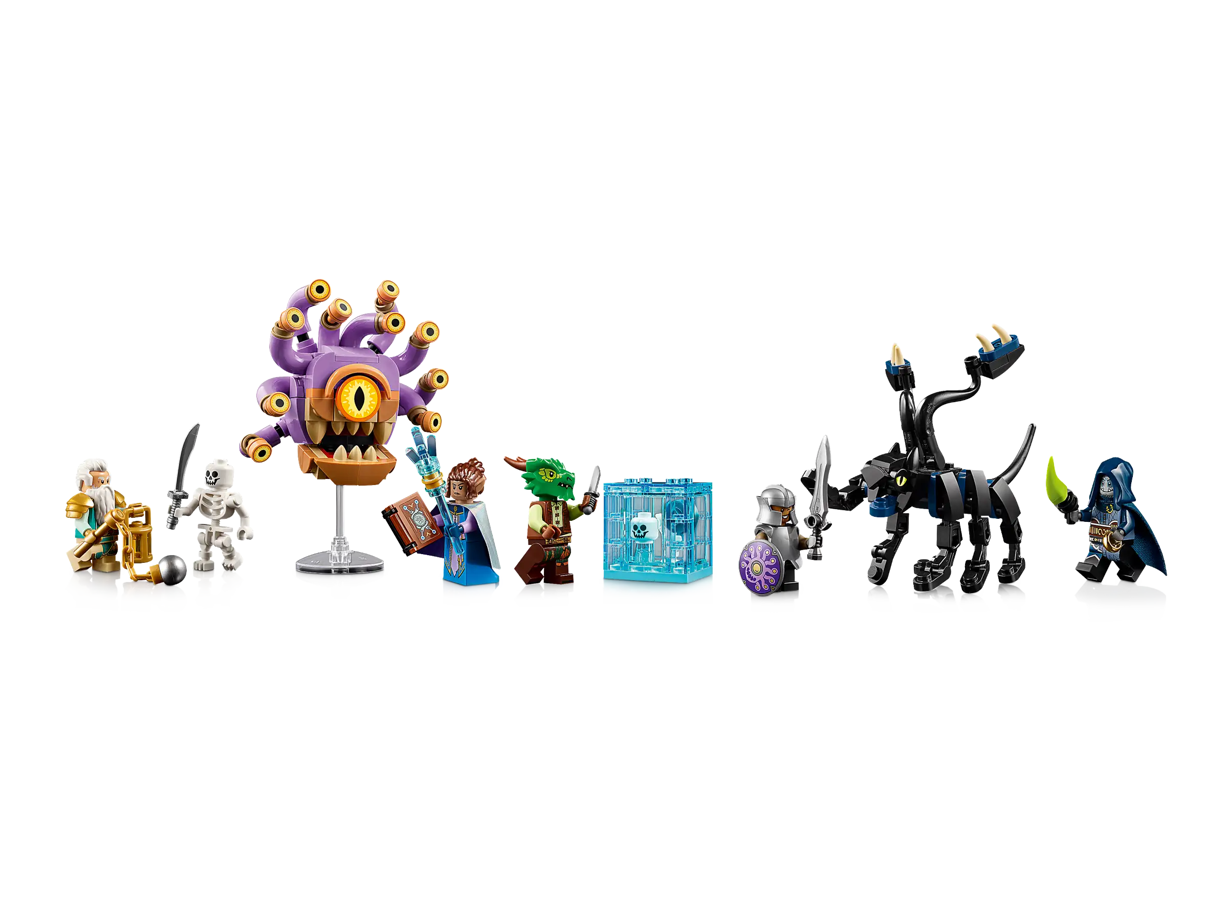 - Mythical creature figures – Includes an elf wizard, a dwarf cleric, a gnome fighter, an orc rogue and dragonborn Alax Jadescales LEGO® minifigures, plus monsters such as an owlbear and a beholder