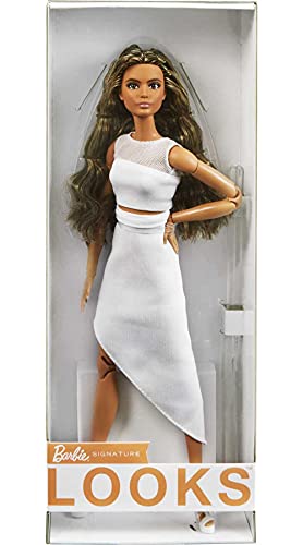 Barbie Signature Barbie Looks Doll (Brunette Wavy Hair) Fully Posable Fashion Doll Wearing White Skirt for Collectors - GTD89