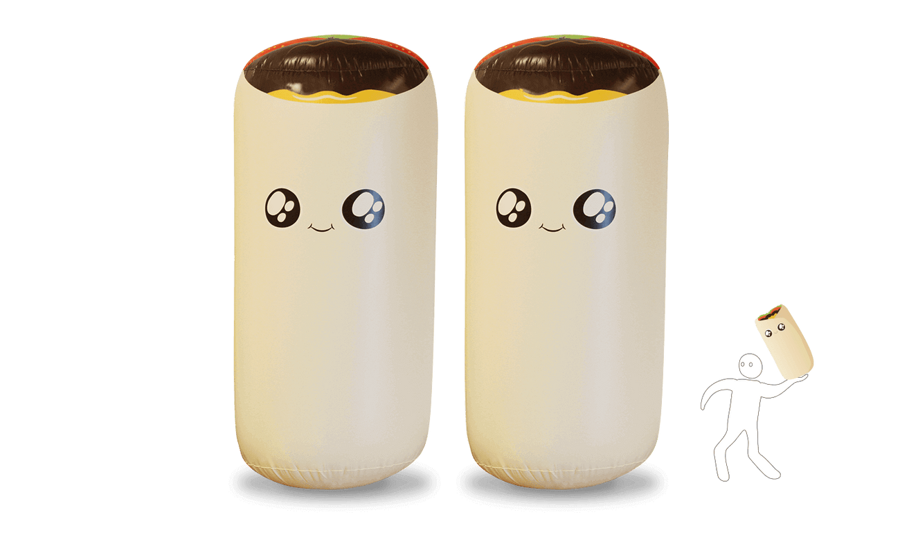 This is the ~extreme~ version of the hit dodgeball card game Throw Throw Burrito. Inflate the pair of huge, inflatable Burritos, place them near a table and deal out the cards. Earn points by collecting three of a kind. Play Burrito Cards and force your friends to battle. Duel to determine the winner. Duck, dodge and dive incredibly large, airborne burritos or get hit and receive a Burrito Bruise!