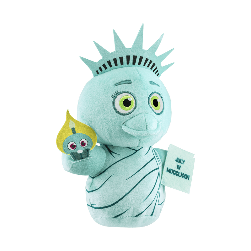 Free to move about, Chica from Five Nights at Freddy’s wants to jump into your arms as a Liberty Chica Plushie. This cuddly Liberty Chica Plushie is dressed as the Statue of Liberty, but instead of a torch, she has a cupcake bomb. In the other hand, she holds a tablet with the date of the Declaration of Independence in Roman numerals. Take her home to add her to your Five Nights at Freddy’s set. Collectible plush is 6-inches tall.