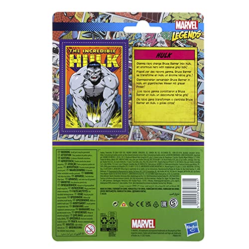 Details: Product Description Gamma rays change Bruce Banner into Hulk, an enormous hero with massive grey bulk! With over 80 years of entertainment history, Marvel has become a cornerstone of fan collections around the world. With the Marvel Legends Series, fan favorite Marvel Comic Universe and Marvel Cinematic Universe characters are designed with premium detail and articulation for posing and display in collections. From figures to vehicles to premium roleplay items, the Marvel Legends Series offers elite character-inspired product for Marvel fans and collectors. Additional figures each sold separately. Subject to availability. RETRO-INSPIRED PACKAGING: Fans, collectors, and kids alike can enjoy this 3.75-inch-scale classic Retro 375 Collection Grey Hulk figure, inspired by the character from the Marvel comics MARVEL COMIC-INSPIRED DESIGN: This Retro 375 Collection Grey Hulk figure has premium design, detail, and articulation for posing and display in a Marvel collection PREMIUM ARTICULATION AND DETAILING: This quality 3.75-inch Legends Series Retro 375 Collection Grey Hulk figure features multiple points of articulation and is a great addition to any action figure collection MARVEL UNIVERSE IN 3.75-INCH SCALE: Look for other Hasbro Marvel Legends Series figures in the Retro 375 Collection (each sold separately) with Marvel comic-inspired characters, including Hulk, Carol Danvers, Captain America, Magneto, Spider-Man, and Human Torch. (Each sold separately, subject to availability.) Includes: figure. Figure scale: 3.75 inches Ages 4 and up. WARNING: CHOKING HAZARD – Small parts. Not for children under 3 years. Safety Warning Suitable for ages 4 and up. Warning: choking hazard – not suitable for children under 3 years as small parts are included.